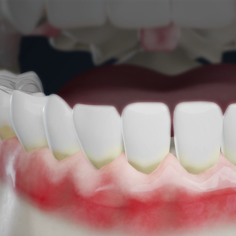 Gum recession occurs when gum tissue pulls away from the tooth, making teeth appear longer and exposing the root. It is often a sign of underlying inflammation, bone loss, or periodontal disease.
